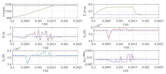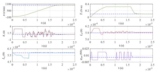 Figure 8 and Figure 9 show results of parameter identification in the PMSM. Figure 8 shows results while the velocity  and the load . Figure 9 shows results while  and .