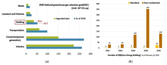 Given the global shortage of fossil fuel reserves and the emergence of climate change, increased attention is being devoted to greenhouse gas reduction and energy conservation [1,2]. In October 2021, the Republic of Korea deliberated and decided on the ‘2050 Carbon Neutral Scenario Plan’ and the ‘2030 Nationally Determined Contribution (NDC) Upgrade Plan’ [3,4]. As shown in Figure 1a, upgraded plans increased by 40% the total greenhouse gas emission reduction goal, compared with the previously established 2018 target [3,5]. In particular, the reduction target in the building sector was strengthened by 32.8% compared with the 2018 reduction rate, with the goal of reducing 35.0 million tons of CO2eq [3].