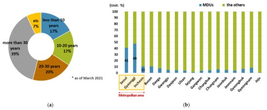 (a) Age status of domestic buildings as of March 2021 [15,16]; (b) Comparison of energy consumption by region for MDUs and other uses [22].
