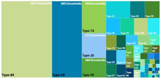 The floor areas of 46 complexes were analyzed, to study how area affects facility capacity, wall insulation, and window size. A total of 73 area types were applied to 46 complexes, with the smallest type being 11 m2 and largest type 273 m2. Figure 4 shows the results of the most frequently applied types across 46 complexes consisting of 46,398 households in total. After analyzing 46 complexes, the most applied types were 59 m2, 74 m2, and 84 m2. Among 46 complexes, 19 of them had 59 m2, 74 m2, and 84 m2 types.