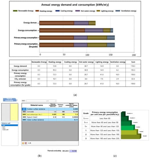 Input and output of ECO2 program; (a) Analysis results: annual energy demand, energy consumption, and primary energy consumption (b) Input of external wall insulation (c) primary energy consumption per unit area per year by building energy efficiency grade.