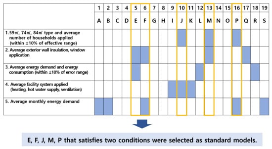 Among the 46 MDU complexes, 19 complexes including 59 m2, 74 m2, and 84 m2 types were selected as standard groups due to their frequency of occurrence. Figure 6 shows five factors for selecting standard MDUs. Floor area, exterior wall and window insulation, energy demand and energy consumption, facility system, and monthly energy demand were analyzed. Among 19 MDUs, five complexes E, F, J, M, and P satisfied two or more of the five factors, and were selected as standard MDU complexes for this study.