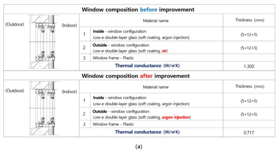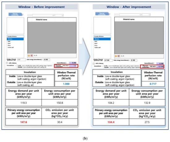 For recently built energy-saving MDUs, ‘argon injection low-e double-glazed windows (soft coating)’ with thermal conductance of 0.717 W/m2K were applied. To analyze the window improvement effect, inputs for the ECO2 program were carried out by dividing the window category into household windows and balcony extension windows. Figure 8a shows the ECO2 input conditions for balcony extension windows in the M complex, which showed the best result. In the case of the balcony extension type windows in the M complex, ‘argon injection low-e double-glazed (soft coating) + air-injected low-e double-glazed (soft coating)’ of 1.3 W/m2K was applied. As shown in Figure 8b, by applying air to one side of the filler, the thermal conductance of the improved window was reduced by 0.58 W/m2K compared to the old type [44,45,46]. As a result of the ECO2 analysis of E, F, J, M, and P complexes, the average annual primary energy consumption reduction per unit area per year after improvement was found to be 8.5 kWh/m2y, as shown in Table 5.