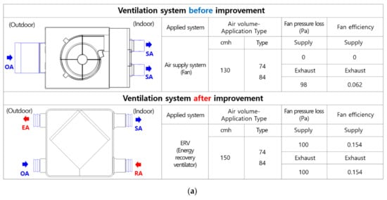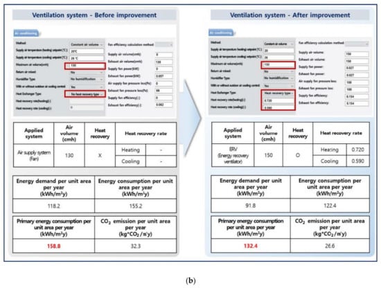 For the ventilation systems in new energy-saving MDUs, 100 cmh (cubic meter per hour, m3/h) was applied to the 59 m2 type, and 150 cmh was applied to the 74 m2 and 84 m2 types. Heat recovery efficiencies applied to the 59 m2 type were heating 77% and cooling 60%, whereas those applied to the 74 m2 and 84 m2 types were heating 72% and cooling 59%. Figure 9a lists input values for the ECO2 program for analyzing the ventilation system improvement effect. Input factors were heat recovery rate (efficiency), air volume flow rate, fan power, and fan pressure loss [24]. Figure 9b shows the input conditions of the E complex which showed the best improvement result. In complex E, the ‘floor heat supply system’ was applied before the improvement. This is a system that supplies outdoor air to the inside of the house using floor heat [47]. If the floor heat supply system was replaced by total heat exchanger (ERV) used in new energy-saving MDUs, the primary energy consumption per unit area per year was reduced by 26.4 kWh/m2y.