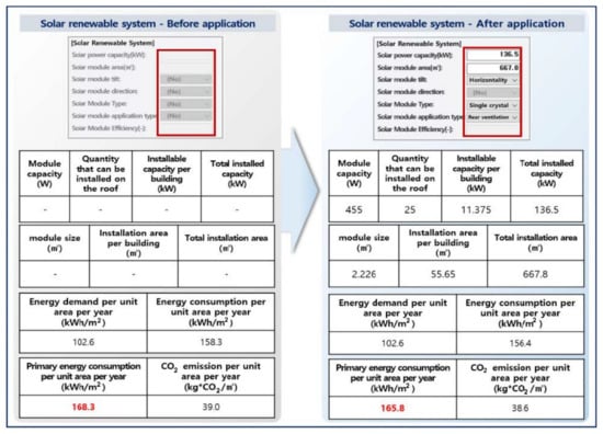 Among 10 MDU complexes that obtained building energy efficiency Grade 1+ or higher in 2021, 9 complexes installed solar PV modules on the roof. On the other hand, new and renewable systems were not applied to all of the standard model E, F, J, M, and P complexes before the improvement. For analysis of the application of the new and renewable systems, it was assumed that solar PV modules were installed on the roof by referring to the application status of 9 new energy-saving MDU complexes [47,48,49].
