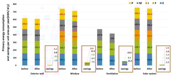 Figure 11 shows primary energy consumption per area per year after implementing four factors (exterior wall insulation material, windows, ventilation system, and solar PV renewable system) to E, F, J, M, and P complexes using the ECO2 program. Among the four factors, window and ventilation system improvement showed the best energy saving results. Thus, these two factors were selected as the optimal improvement factors. The energy saving effect of applying these two improvement factors simultaneously was further analyzed. In addition, for standard E, F, J, M, and P MDU complexes, it was determined whether the improvement satisfied 20% improvement of energy consumption, which is required to satisfy the criteria for Green Building Certification [50,51,52].