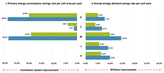 When both improved window and ventilation system were simultaneously applied to E, F, and M MDUs, average primary energy consumption reduction per unit area per year became 26.6 kWh/m2y, as shown in Table 8.