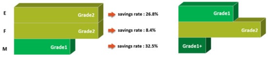 The reduction rate of primary energy consumption and the change in building energy efficiency rating after the simultaneous improvement of windows and ventilation systems can be viewed in Figure 13. The building energy efficiency rating of the E and M complexes was improved by one grade, and the primary energy consumption per unit area per year reduction rates were 26.8% for the E complex and 32.5% for the M complex. Complexes M and E met the condition of improving primary energy consumption by 20% per unit area per year, which is the standard for green building conversion in the ‘Energy Performance Improvement Standard for Existing Buildings’ [50].