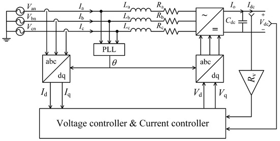With the assumption that the grid is ideal, the phase components can be converted into the ones in d-q domain through the Clarke-Park transformation. The open-loop model of the VSC is presented in Figure 2, where is the fundamental frequency of the grid, and are the diagonal equivalent resistance and inductance of the filter of VSC in domain, and are the corresponding duty cycle of and . and are the grid phase voltage in domain, given as