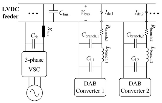 Short-circuit currents and characteristics can be obtained by applying the IEC 61660 standard [12]. However, Ref. [13] shows that the real short-circuit current can be considerably different from that. Hence, for this study, an example network (Figure 3) will be used utilizing a charging stations at the LVDC feeder. In this figure is the cable inductance and resistance of the dc bus, is the filter capacitance of the dc bus, , and form the cable impedance of each charging station branch, and is the input capacitance of DAB converters.