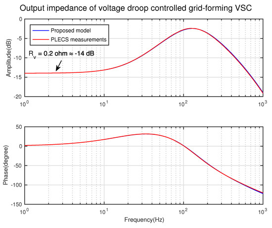 The output impedance validation of voltage droop controlled grid-forming VSC.