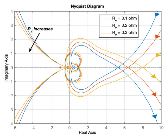 The Nyquist contour of system minor loop gain with different virtual resistance at rated power.