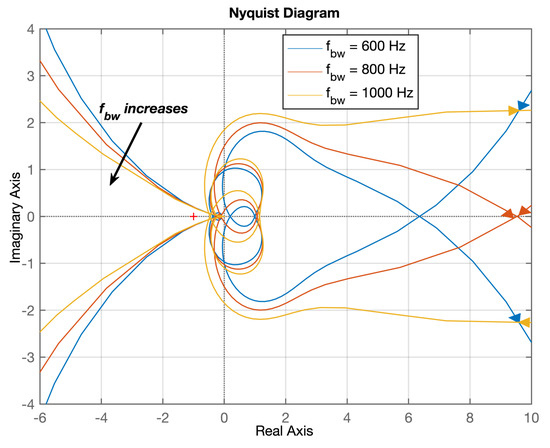 The Nyquist contour of system minor loop gain with different bandwidth of current controller at rated power with equal to 0.2 ohm.