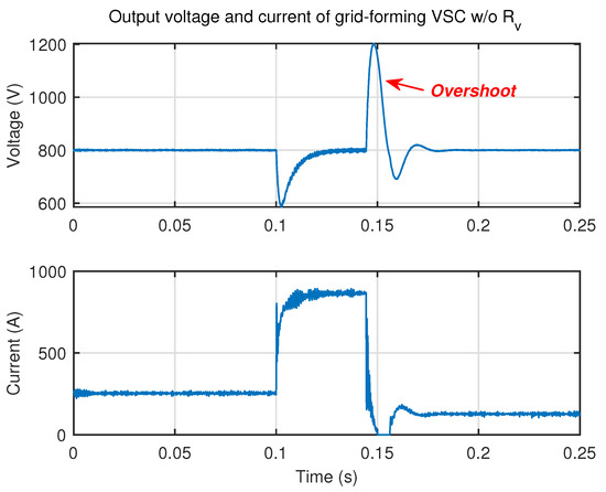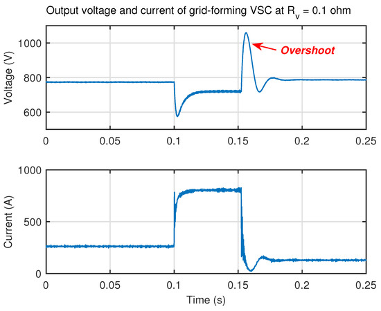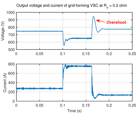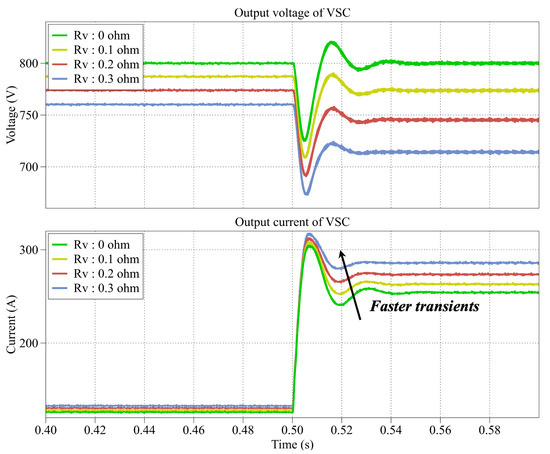 In addition, it can be seen in Figure 13 that the output voltage of VSC reaches around 650 V when is equal to during the fault, validating the calculated results of analysis section. Moreover, it can be seen that with the increase of virtual resistance, the voltage overshoot after the soft fuse tripping is reduced, indicating that the larger virtual resistance improves the transient performance, which is consistent to the conclusion obtained from Figure 9.