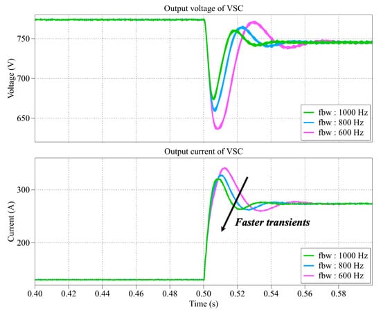 The transients as load steps from 50 kW to 100 kW with different bandwidth of current controller.