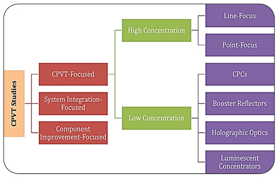The CPVT system is considered a relatively complicated system. Despite enormous research, this system has no precise classification. Sharaf and Orhan [10] classified CPVT into three distinct types: CPVT-focused, system integration-focused, and component improvement-focused, as shown in Figure 1. We can also see from Figure 1, that the CPVT system has been divided into high concentration and low concentration. The high-concentration CPVT systems are divided into linear-focus and point-focus according to their concentration shape. The system could be based on linear Fresnel reflectors, linear Fresnel lenses, or parabolic trough collectors in the linear focus. While in point-focus, the system could be based on parabolic dish collector, heliostat field central receiver or point focus Fresnel lenses. Concentration Photovoltaic Thermal CPVT systems with a point focus will be studied in the current research.