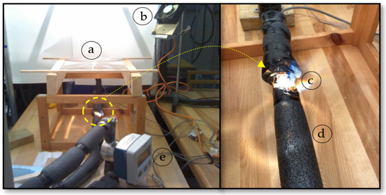 Photograph of the experiment test section: (a) Fresnel lens; (b) cooling fan; (c) MJPV; (d) pipe and insulator; (e) flowmeter.