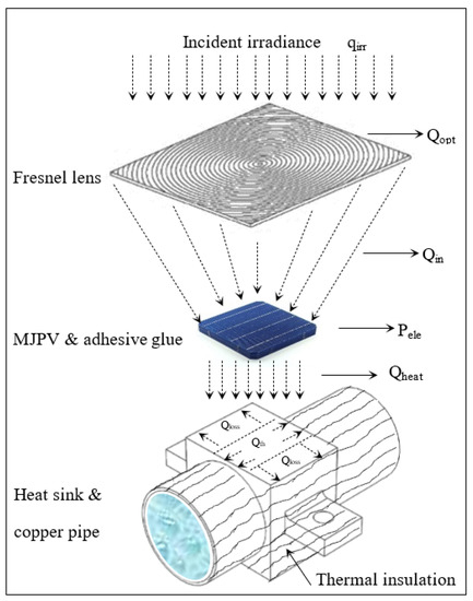 Figure 3, shows the energy balance through the CPVT system. As we can see, part of the total incident energy (qirr) on the MJPV solar cell is lost as optical losses (Qopt), while the remaining (Qin) is converted into two forms. The first portion is converted to electrical power (Pele), while the remaining is converted into heat (Qheat). A portion of this heat (Qth) is transferred to the water by convection, while the rest (Qloss) is transferred to the ambient by convection and radiation.