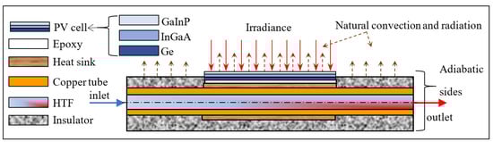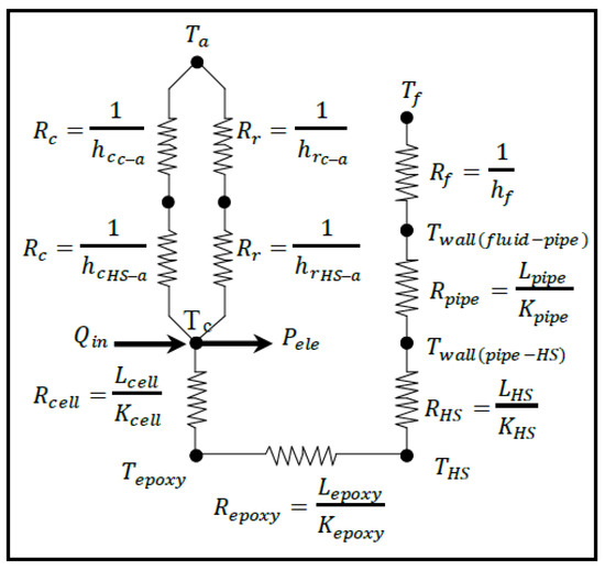 The proposed model’s heat transfer characteristic and thermal performance analysis are based on an energy balance around the CPVT components. The energy balance includes the incident solar radiation, optical losses from the Fresnel lens, thermal losses from the CPVT, and the heat flow into the HTF. Figure 4 shows a side view of the one-dimensional steady-state energy balance for a cross-section of the CPVT model. Three heat transfer mechanisms exist: conduction, convection, and thermal radiation. Further, a part of this heat is transferred within the multi-junction solar cell solid layers by conduction. The remaining parts of the heat are lost to the surrounding environment by convection and radiation. As stated by Chou et al. [28], in the structure of the MJPV, the top (GaInP) and middle (InGaAs) subcells are much thinner than the bottom (Ge) substrate. Moreover, the (Ge) layer absorbs long-wavelength photons (870–1950 nm) and usually absorbs the most received irradiation. Therefore, the MJPV solar cell can be modelled as one homogeneous Germanium cell (Ge), and they would not influence the junction temperature. The thermal resistance diagram corresponding to the CPVT assembly layers is shown in Figure 5.