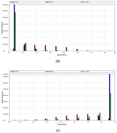Further, the aspect ratio represents the balance of the cells’ sides. To achieve an excellent overall mesh quality, it should be less than 100. Figure 7a illustrates the meshed CPVT model’s side view and isometric view. The mesh nodes were more than 1.3 million, whereas the mesh elements exceeded 2.0 million and the measured mesh qualities for the skewness, orthogonal quality and aspect ratio were 0.13, 0.86, and 26.87, respectively. Besides that, Figure 7 displays the mesh metrics graphs for the skewness (Figure 7b), and orthogonal quality (Figure 7c).