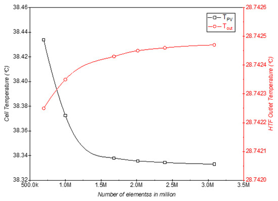 Six mesh independence tests have been conducted to obtain mesh-independent solutions and sustain credible results. The objective of these tests is to eliminate the influence of discretization, rounding, and iterative errors. The number of mesh elements ranges from 0.6 to 3.0 million, and the study was undertaken in terms of cell temperature and HTF outlet temperature. As shown in Figure 8, both cell temperature and HTF outlet temperature do not vary significantly with increasing the grid elements further. With these results, the number of mesh elements used in this study is sufficient for accuracy and simulation run time.