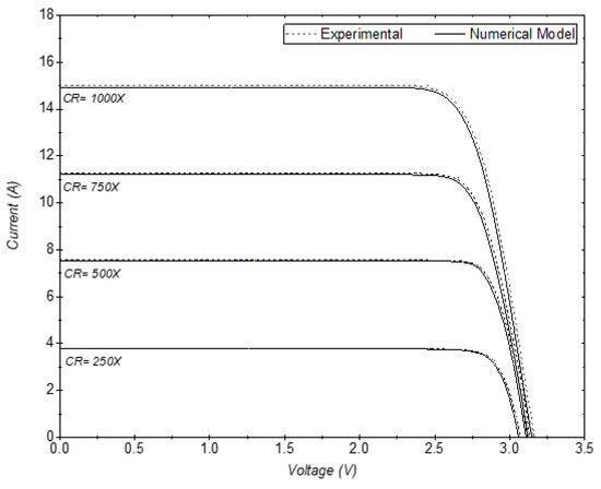 The present study focused on experimental investigation and numerical modelling for a CPVT system based on a point-focus Fresnel lens concentrator, a single cell MJPV, a copper heat sink, and a copper pipe. The most common approach to evaluate the electrical characteristics of a CPVT system is to find its response curves, which provide short-circuit current Isc, open-circuit voltage Voc, and maximum power output. These responses are known as the I-V and P-V curves. In this regard, a mathematical I–V and P–V curve model was developed to calculate the current and voltage of the MJPV at different concentration ratios at the standard MJPV surface temperature. Therefore, the model is validated by comparing the results with indoor experimental data from manufacturers. Figure 9 shows the I-V curve created by the mathematical model compared to the manufacturer’s experimental data at an MJPV surface temperature of 25 °C and different concentration ratios.
