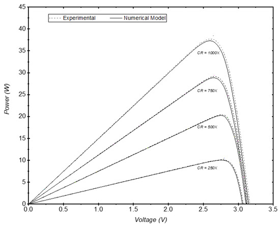 It is observed that the changes in Isc with radiation are more significant than the changes in the Voc. However, both changes increase with the incident radiation. The Isc increased by almost triples due to the increased CR from 250× to 1000×. Moreover, it can be noticed that the MJPV model simulation results of the I-V curve are a good match with the experimental data from the manufacturer, where the maximum percent error is less than 2%. Figure 10 shows the P-V curve generated by the developed electrical model under the same conditions. Figure 10 indicated that the higher concentration ratio would positively influence the solar cell output power.