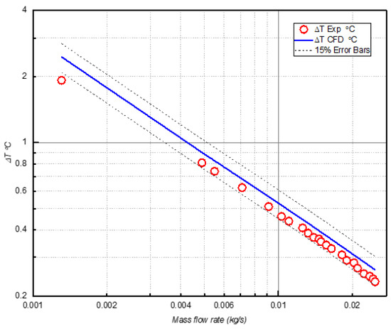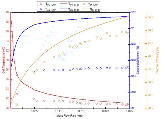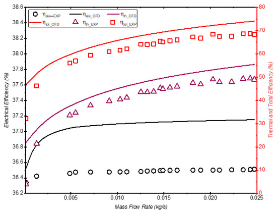 Figure 11 shows the effect of varying the mass flow rate of HTF on the temperature difference between the inlet and outlet of HTF. The temperature difference decreases as the mass flow rate of HTF increases. The results revealed a slight discrepancy between the experimental and simulation results attributed to the heat losses associated with the experimental model. Further, Figure 12 illustrates the electrical and thermal efficiencies changes with the mass flow rates. Based on Figure 12, as the mass flow rate increased, both electrical and thermal efficiencies increased. The highest thermal efficiencies of the experimental and CFD models were 49.5% and 55.4%, respectively, with an error percent of 10.65%. In contrast, the highest electrical efficiencies were 36.5% and 37.1%, respectively, with an error percent of 1.35%. Also, Figure 12 displays the total thermal and electrical efficiencies of the experimental and CFD models, which amounted to 68.7% and 73.5%, respectively.