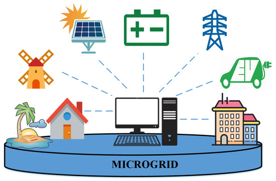 Distributed energy resources (DERs), e.g., PV arrays and wind turbines, are becoming the main component of future power system, to ensure system sustainability and reduce fossil fuel-based power generation [1,2]. DERs are also very useful to supply power to the areas with remote or no access to the main grid or areas, with no transmission and distribution infrastructure [3,4]. However, renewable energy systems (RESs) also introduce challenges like intermittency in power generation, creating discontinuity in transmission and load distribution. In recent years, the integration of energy storage systems (ESSs) has been substantially increased to overcome this challenge [5]. Another solution to this challenge is the emergence of microgrids (MG) to integrate DERs with ESSs and loads, and form an independent low voltage, islanded, or grid-connected network [6], as shown in Figure 1. In grid-connected mode, an MG should provide a bi-directional power flow to connect to a distribution network, while in islanded mode, the EMS manages to supply the DER power output to the MG load, and store it in the ESSs [7].