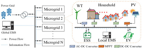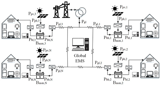 To take advantage of the bi-directional power flow, a new concept of multi-microgrid (MMG) system has emerged to allow for the interaction of neighboring MGs [8,9], as shown in Figure 2. In terms of topology, the MMG systems are categorized into two frameworks, i.e., centralized and distributed. In the centralized topology, the EMS is easy to design and implement; however, it suffers from high computational complexity, longer communication distance, communication delay, and lower reliability [10]. In the distributed framework, each MG in the MMG network is managed by a local EMS, interacting with the neighboring MG using global EMS to achieve a similar objective [11]. If we increase the number of MGs in the MMG distribution network, the MG scheduling becomes a challenge due to inherent uncertainties of power system, load demand, and RESs output power. To overcome this problem and enhance the efficiency of a MMG system, several studies are done by different researchers [12,13,14]. A dynamic pricing scheme was proposed for a home energy management system to obtain an economic benefit [15]. In [16], an optimization problem is proposed for the maximum utilization of the solar PV system through battery charging. In [17], a problem is formulated for minimizing the purchasing power from a conventional grid. In [18], a standalone system is presented and a methodology is proposed to find an optimal system sizing for household electrical appliances, considering the system cost. In [19], a similar work for Optimal planning and design of low-voltage, low-power solar DC microgrids for the selected cities in India is presented. In [20], an optimization approach is proposed to minimize the power flow between the solar PV system, ESSs, and grid with the main objective of minimizing the net cost of ESS charging.