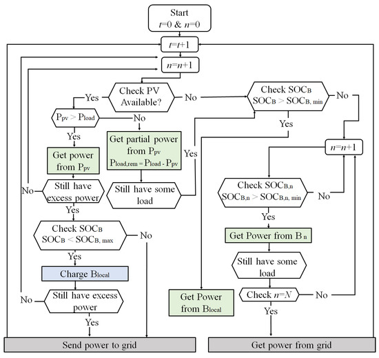 In the former case, Equation (12) will remain valid and unchanged, while in later cases, the Equation (12) will not remain valid to satisfy load demand. Therefore, the ESS should receive power from its neighboring MG ESS. If the neighboring MG also has insufficient power, then it will check the next neighboring MG (n = n + 1) and it will continue until the Nth MG. So, the ESS charging/discharging as given in Equations (11) and (12) will be modified and are now given by