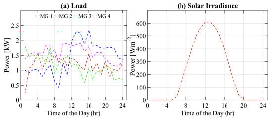 In this section, we have presented the system parameters and case studies. The number of MGs in the study can be considered as N; however, for simplicity we consider N as 4. As the changes in MG load and generation profile are instantaneous, time resolution should be minimized. For our presented work, the time resolution t is 1 h to lower the computational burden. The distribution voltage is considered to be 48 V. The solar irradiance data is adopted from the online available source, the National Solar Radiation Database (NSRDB), for a given location [35]. The NSRDB is a serially complete collection of hourly and half-hourly values of meteorological data and the three most common measurements of solar radiation: global horizontal, direct normal, and diffuse horizontal irradiance. The peak sunlight hour (PSH) for a given location is 4.97 per day, while the hourly incidence irradiance of a given location is also presented in Figure 5b. The load profile is adopted from the Pakistan Residential Electricity Consumption Dataset (PRECON) [36]. PRECON is a first of its kind extensive dataset of electricity consumption patterns of users in developing countries. The dataset has been collected through smart meters over a period of one year. The cumulative load of each MG is given in Table 1 and the hourly load of each MG is also presented in Figure 5a. Depending on the load profile, each MG has been installed with a varying PV and ESS size. All system parameters are shown in Table 1.