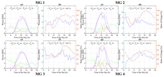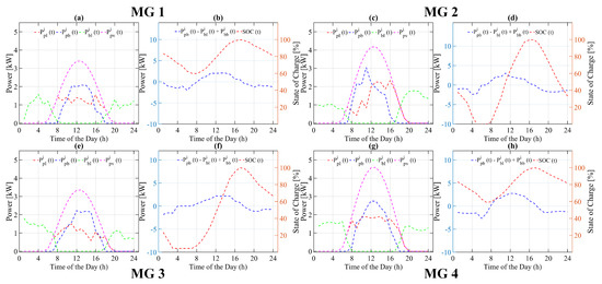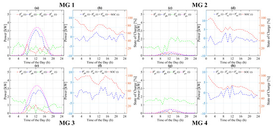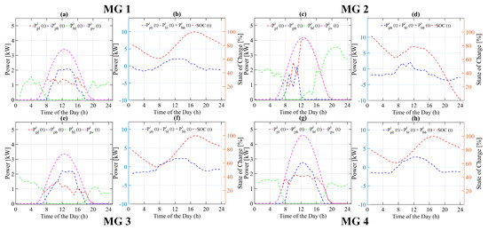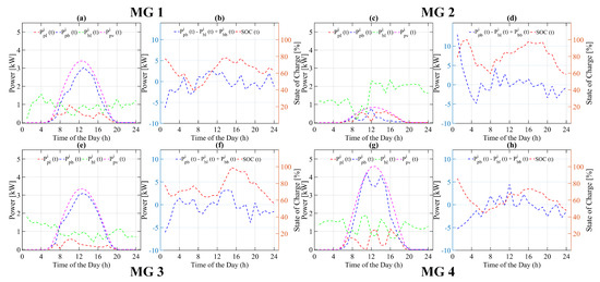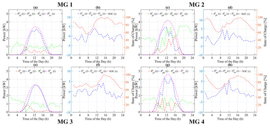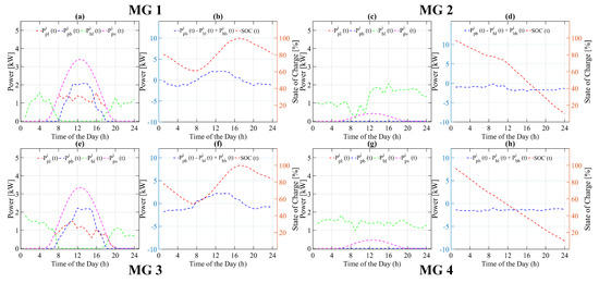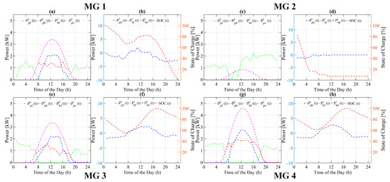 Case B: In case B, the 2nd load is doubled as compared to its normal day load; however, the installed PV system size and generation is the same as the normal day load. The load, PV generation, and SOC of ESS of all remaining MGs is the same as of the normal day. It is obvious that there will be some power shortage at the 2nd, because the available power from ESS and PV generation is not enough to run the load for complete daily cycle. Further, as soon as ESS reached , there would be no power available to charge it. For the heuristic state flow based strategy, as seen in Figure 8d, for the 2nd MG the SOC of ESS during time interval to keeps decreasing, as there is no PV power available to charge ESS. The negative value of power flow shows that it keeps discharging during this time interval. Similarly, as seen in Figure 8b,f,h, the SOC of all other remaining MGs also keeps decreasing for said time interval, but the discharging rate is not as fast as for the 2nd MG. As soon as the PV panel starts generating power, the SOC of ESS of each MG starts increasing until as as seen in Figure 8b,d,f,h. As also seen from Figure 8d, the ESS of the 2nd MG is in charging mode during to , as power flow is positive. The ESS of each MG keeps charging as long as the power generated by the PV panel is more than the load, as shown in Figure 8a,c,e,g. During time interval to , the SOC of ESS of each MG again starts decreasing, because the power generated by the PV panel is either zero or less than the load at that time. Therefore, the excess load is now run by the available charge of ESS for the remaining time cycle. At the end of the cycle the SOC of ESS of each MG is at its default value, as the overall load is the same as the power generated by the PV system for 24 h. This is not the case for the 2nd MG, since the load is twice that of to the power generated by PV system. Therefore, the remaining load is run by ESS, which in turn decreases the SOC to zero for the next time cycle.
