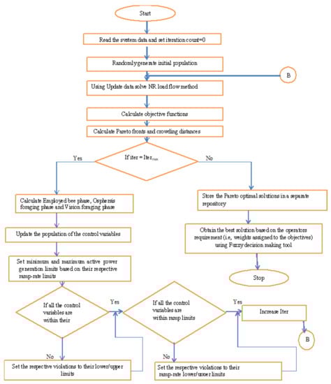 To solve the multi-objective problem, the proposed non-dominated sorting hybrid fruit fly-based artificial bee colony (NSHFABC) algorithm was implemented. The steps for the proposed NSHFABC are detailed in the flow chart depicted in Figure 1. The non-dominated sorting and fuzzy decision-making process is given in [2].