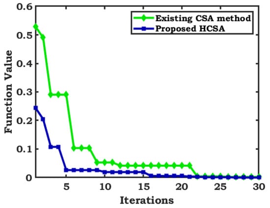 From Table 3, it is observed that the function values are 0.00029, 0.00020, 2.9285 × 10−7, and 1.6234 × 10−12, for PSO, CSA, ABC, and HFABC, respectively. The standard deviation is 0.086 and 0.035 for the ABC and proposed HFABC methods, respectively. The computation times are 8.23299, 6.9547, 2.12912, and 0.5297 s, respectively, for PSO, CSA, ABC, and HFABC. From these statistical analyses, the proposed method yields a better value compared to that of the existing methods.