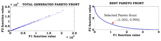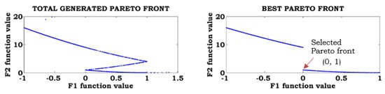 The proposed method was analyzed with the SCH2 function, considering equal weights for the objectives. The total generated Pareto front, best Pareto front, and selected Pareto fronts are shown in Figure 5. From this figure, the best solution for the SCH2 function is 0, 1.