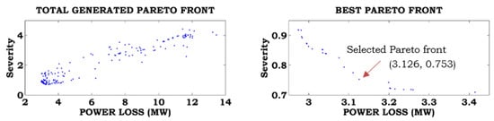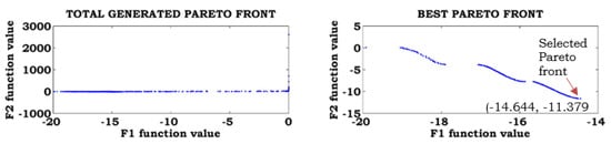 The proposed method was applied to the Kursawe function, considering equal weights for the objectives. The total Pareto front, best Pareto front, and marked selected Pareto fronts are shown in Figure 6. From this figure, the best solution for the Kursawe function is −14.644, −11.379.