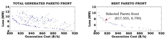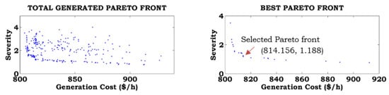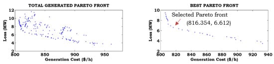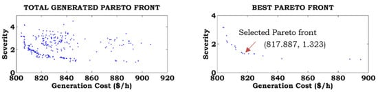 The total Pareto generated front, best Pareto front, and preferred Pareto front are based on the user requirements obtained from the fuzzy decision approach for different combinations of the objective functions without consideration of ramp rate limits (Case-A) and with consideration of ramp rate limits (Case-B), as shown in Figure 7, Figure 8, Figure 9, Figure 10, Figure 11 and Figure 12. To show the effects of ramp rate limits on the total generated solutions, the best Pareto and preferred Pareto fronts for equal weights of the objective functions are shown in separate figures. From these figures, it can be noted that the function values are increased by considering ramp rate limits, compared to without consideration of ramp rate limits.