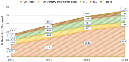 Increase in global emissions of GHG in GtCO2-eq/yr between 1970 and 2018, adapted from [1].
