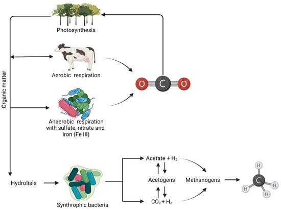 In methanogenic habitats, complex organic matter is degraded to CH4 by symbiotic relationships between different groups of anaerobic microbes. Substrates used for CH4 production include CO2, H2, acetic acid and methyl-group-containing molecules. Such compounds are naturally produced during the anaerobic degradation of organic matter, in which methanogens occupy the terminal niche of the electron transfer chain [28] (Figure 2). In addition, methanogenic habitats are poor in electron acceptors such as O2, NO3−, Fe3+ and SO42− due to their rapid consumption during biomass degradation. Moreover, bacteria such as de-nitrifiers and sulfate reducers are thermodynamically more efficient than the methanogens with which they compete for electron acceptors (i.e., NO3− and SO42−), thus inducing the inhibition of methanogens [29,30].