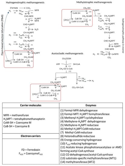 Metabolic pathways, enzymes and co-enzymes involved in methanogenesis. Red squares indicate metabolic reactions common to all three methanogenic pathways. Adapted from [36].