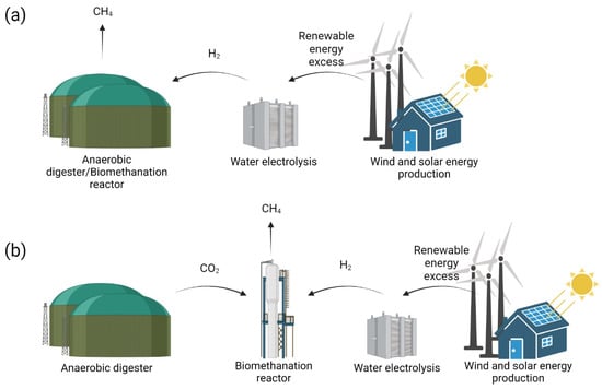 In situ biomethanation can be achieved by injecting H2 derived from external sources directly inside a biogas reactor. Along with the CO2 produced during AD in the biogas reactor, H2 is converted into CH4 by the activity of indigenous HM (Figure 4; in situ biogas upgrading) [54,55].
