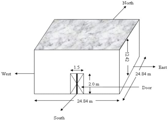 A single-room storage building, having a storage capacity of 2350 tons, was considered in this study. The dimensions of the cold storage room, which were previously optimized for minimum solar gain, were 24.1 m × 24.1 m × 12.0 m [] (Figure 1), as also validated by the results of the field survey data []. The storage room was assumed to be optimally oriented at 31, 20, and 25 degrees with respect to true south in Indore, Jodhpur, and Chennai, respectively []. Openings (i.e., doors) are required in the building for loading/unloading and movements for maintenance and operational purposes. The thermal properties and operational frequency of the provided openings also play a role in overall heat transfer to the interior, and must be considered in the calculation procedure (as discussed in a Section 3.1.1). For calculation purposes and to make the calculation easier, a single door opening of 3 m2 was assumed to be placed in the north wall. The purpose of locating the door in the north side is to protect the entrance from direct sun exposure. In the actual case, the number of door openings may vary on a case-to-case basis and doors may be located in any vertical surface. The construction characteristics of the building components were considered based on the prevailing practices used for cold storage building construction in India, and were verified in the survey. The graphical illustration of the roof, walls and floor used in this study is shown in Figure 2. The detail of the building construction characteristics identified during the survey were presented in our previous study []. The thermo-physical properties of the construction materials are listed in Table 1. The values of the heat transfer coefficients and other surface energy exchange parameters used in the calculation are given in Table 2. The indoor temperature of the storage building was assumed to be 4 °C during the calculation, and was taken from the measurements from the existing cold storage building used for potato preservation [].