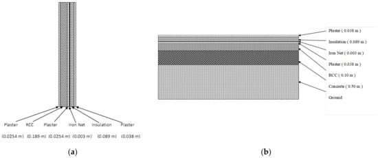 Graphical illustration of the construction details of the building components (a) for the walls and roof, and (b) for the floor.