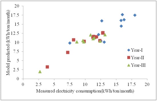 where n is number of simulated values for each year, and m and p represent actual measured and predicted values, respectively. The estimated values of MBE, RMSE, and PRMSE for the energy consumption per ton are listed in Table 6.