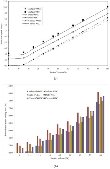 (a) Reduction in the peak cooling load of cold storage for various sunken volumes, with and without roof evaporative cooling. (b) Reduction in the annual cooling loads in cold storage for various sunken volumes, without and with roof evaporative cooling.