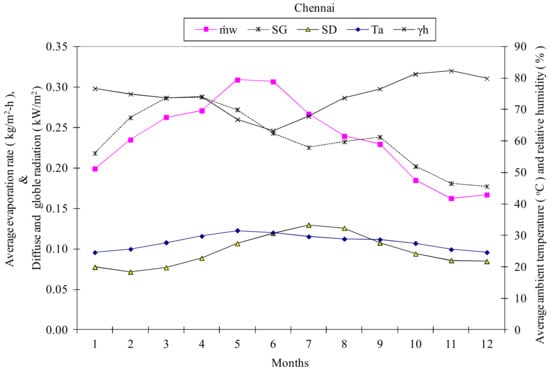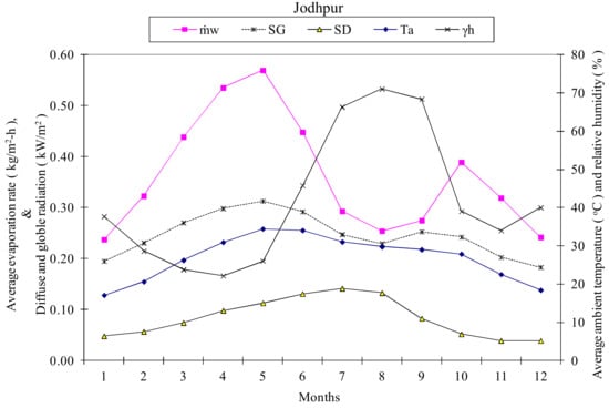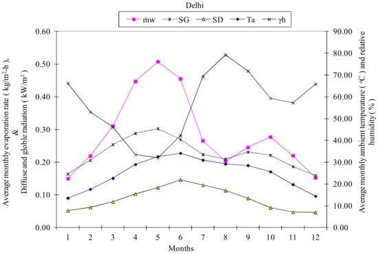 The hourly average values of the climatic parameters used in the calculation were taken from the data book compiled by Mani and Rangarajan []. The annual mean ground temperatures for dry sunlit earth, for Jodhpur, Delhi, and Chennai, are 30.3, 28.1, and 31.2 °C, respectively [].