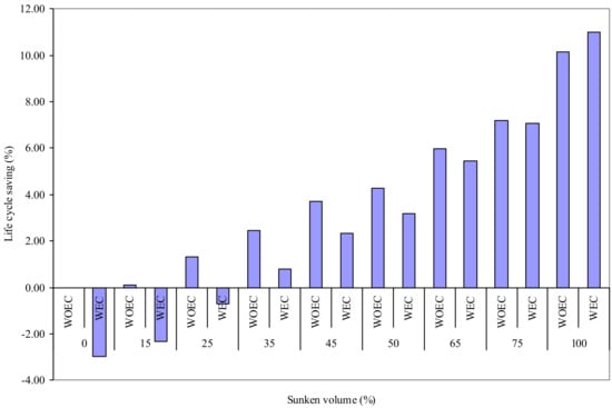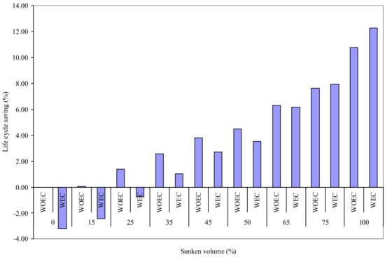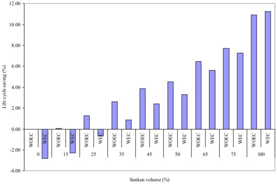 Figure 8, Figure 9 and Figure 10 clearly indicate that earth coupling of the building WOEC was not found to be effective for a sunken volume up to 15% in any of the climates; however, the LCS of the earth-integrated building increases linearly for sunken volumes higher than 15%. Similarly, earth coupling of the building WEC was found to be an effective option only if the sunken volume of the building is at least 35%. In other words, the positive values of LCS can be achieved by considering the earth-coupled building options WOEC and WEC only if the buildings are sunken by at least 25% and 35%, respectively. Moreover, LCS increases with sunken volume in both cases i.e., WOEC and WEC. However, the WEC option becomes effective in a hot–dry climate for sunken volumes greater than 50%. In the other two climates, the effective value of the minimum sunken volume for positive LCS is 65%. This variation occurs because of the decrease in the operational cost of the water pump with an increase in the sunken volume. Equation (11) clearly indicates that the energy consumption in the water pump is almost directly proportional to the head. The required head in the evaporative cooling decreases as the sunken volume increases and, eventually, energy consumption of the water pump decreases. The maximum savings that can be achieved through earth coupling of the building, WOEC and WEC, were estimated to be 9–11% in a hot–dry climate, and 9–10% in both warm–humid and composite climates.