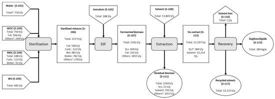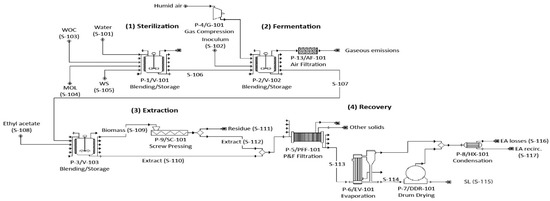 The base scenario was based on previous work performed at different scales, with reactor volumes of 500 mL [9], and 22 and 100 L [29]. These studies demonstrated the feasibility of the production of SL through SSF at bench and pilot-scale, using winterization oil cake (WOC) and molasses (MOL) as substrates, wheat straw (WS) as the support material to provide porosity and resistance to compaction, and S. bombicola ATCC 22214 (American Type Culture Collection, Manassas, VA, USA) as the SL-producing yeast. Under these conditions, the productivity is 0.026 g SL/g dry matter d, and the obtained production yield is 0.72 g SL/g fat (corresponding to 0.26 g SL/g WOC). Based on the results obtained for 100 L reactors, we considered a scale-up factor and assumed to achieve 85% of the SL yield obtained in our previous works, as a conservative value in the simulation [29].