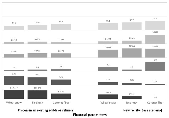 In Figure 3, financial parameters for the three supports (wheat straw, rice husk and coconut fiber) for a process in an existing edible oil plant and in a new facility (base scenario) are presented. Specifically, Figure 3 presents the following parameters: unit production cost (UPC); capital costs (CAPEX); operational costs (OPEX); payback time; internal rate of return (IRR); and net present value (NPV) as defined in the materials and methods section.